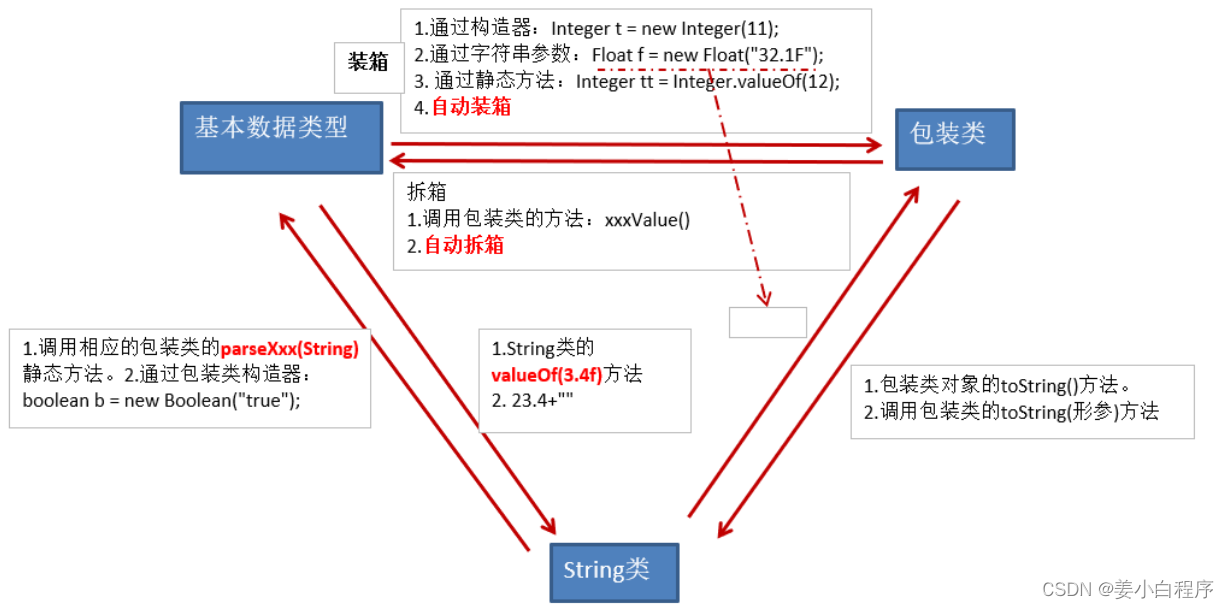 方式1:除了Character类之外,其他所有包装类都具有parseXxx静态方法可以将字符串参数转换为对应的基本类型,例如: