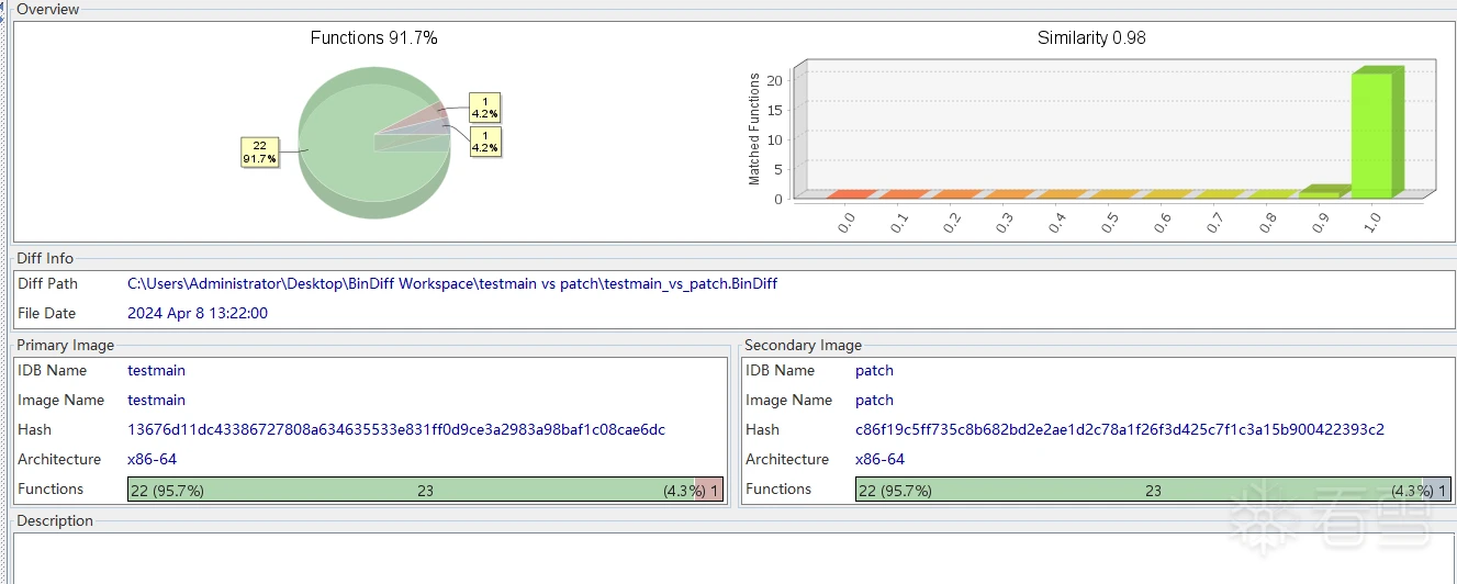 - 差异展示:对于相似度不是100%的函数,用户可以进一步查看具体的差异部分,这对于逆向工程、漏洞分析、软件更新审计等场景尤其有用。