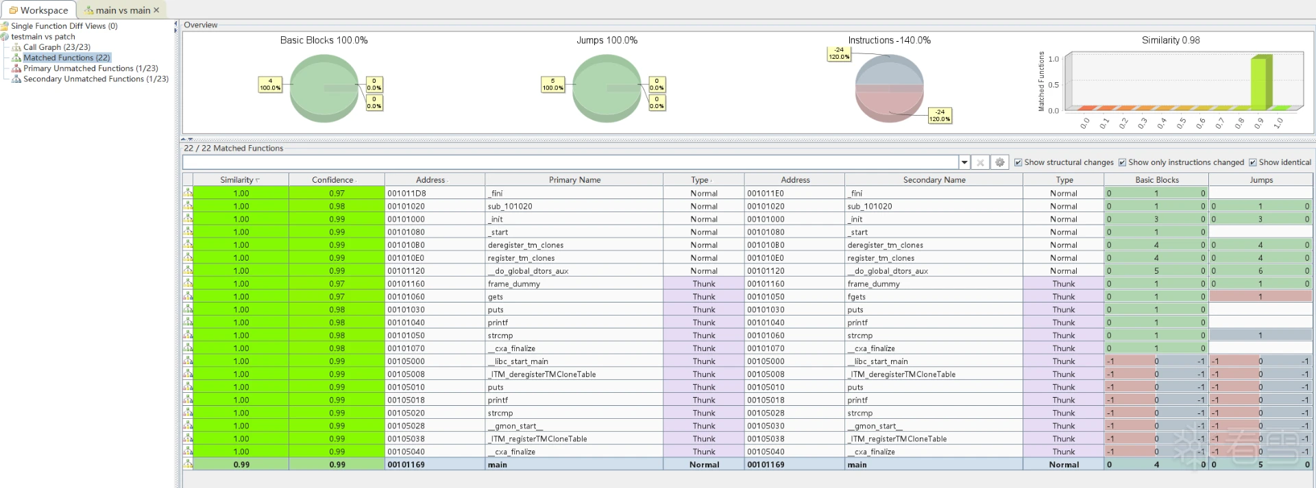 - 函数匹配列表:列出所有在两个版本之间成功匹配的函数及其相似度评分。相似度越接近1,说明两个函数越相似或完全一致。