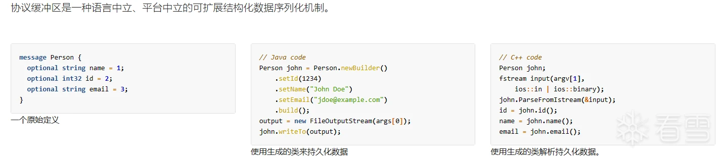想想 XML,但更小、更快、更简单。您只需定义一次数据的结构化方式,然后就可以使用特殊生成的源代码,使用各种语言轻松地将结构化数据写入各种数据流或从各种数据流中读取结构化数据。