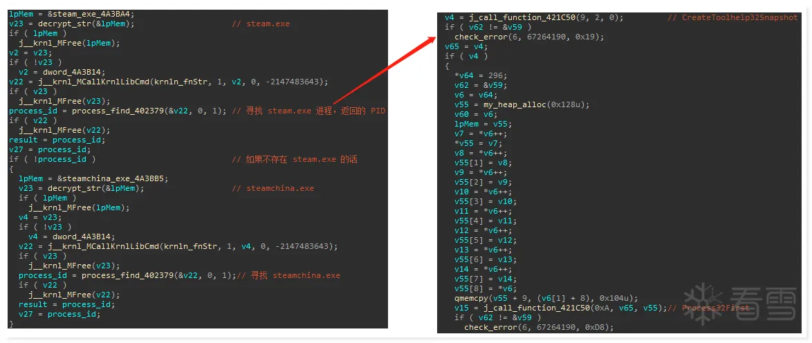 内存遍历 Steam 搜寻 Token 是以线程方式进行的,首先遍历搜寻 steam.exe 的进程号,如果不存在则以 steamchina.exe 进行代替: