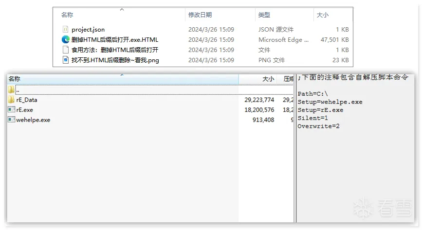文件打开后是一个以 HTML 后缀伪装的 exe 文件 "删掉HTML后缀后打开.exe" ,该 exe 实际上是一个自解压压缩包,并会在启动时执行 wehelpe.exe 和 rE.exe: