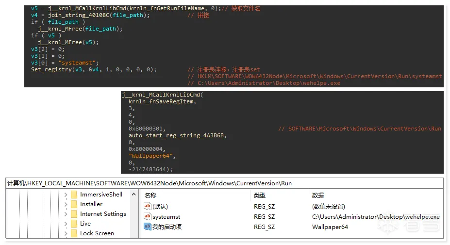 驻留操作——对 wehelpe.exe 和 wallpaper64 设立开机自启动注册表来进行驻留: