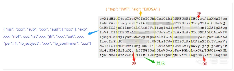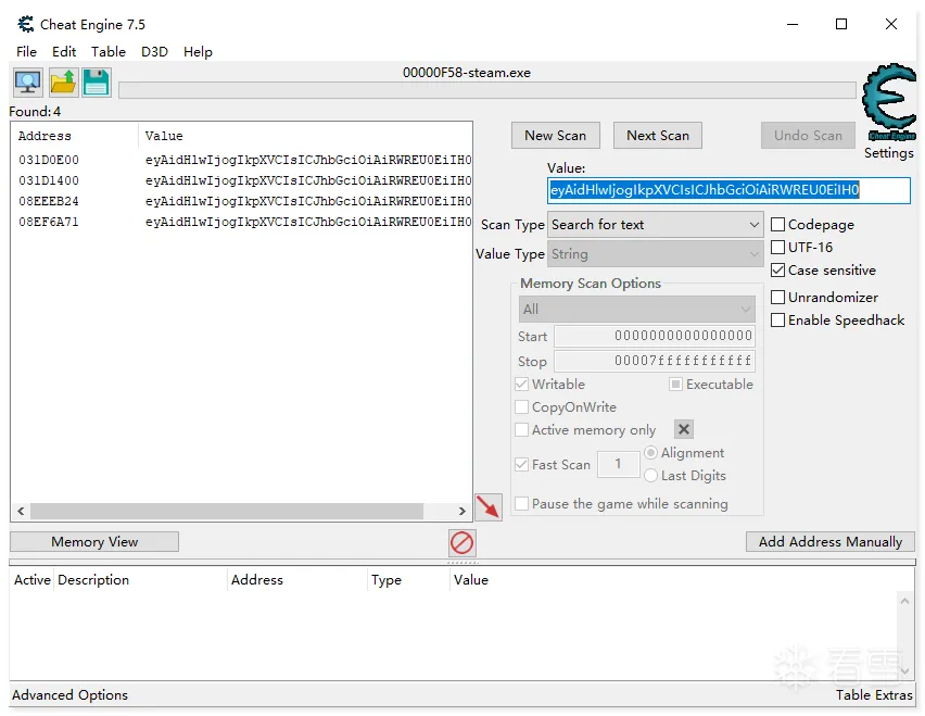 Steam 中的 Token 以标识符 { "typ": "JWT", "alg": "EdDSA" } 开头,并以 "."(2E) 连接 Token 主体和其它内容,它们都以 base64 形式存在于 Steam 进程的内存中。
