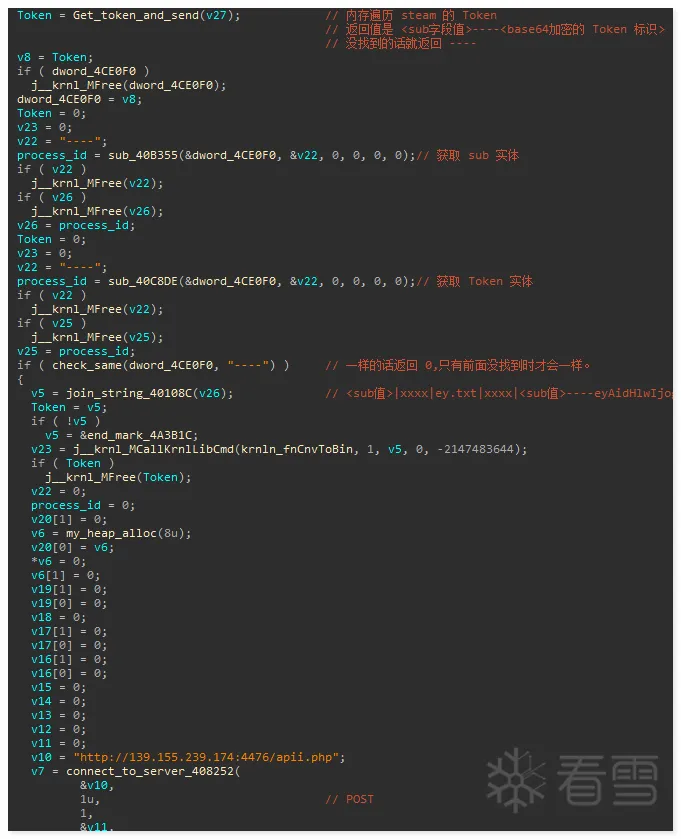 除了在 sub_402843(遍历 Steam 内存的函数)内传输数据外,在外层中,也会根据是否获取到用户 Token 来决定是否传输同样的内容给另一个 C2 139.155.239.174(已失效),判断的依据是查看 sub_402842 返回的是否为 "----"(未找到用户 Token 的标志):