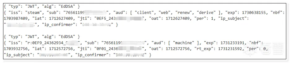 •一种是由 Steam 签发的用于用户与系统之间通信的 Token,"aud" 字段值 "client"、"web"、"renew"、"deriver" 表示可用于客户端应用程序、Web 应用程序、续订令牌、生成其它令牌等操作。