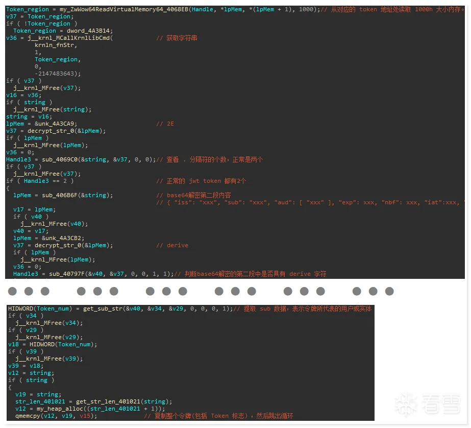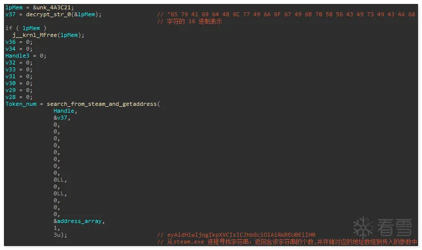 样本会根据前面获取到的 Steam 程序句柄,通过下图中的 search_from_steam_and_get_address(sub_4041A9)函数搜索 Steam 进程内存,获取 Token 标签出现的所有地址,存储在参数数组中并返回出现的次数: