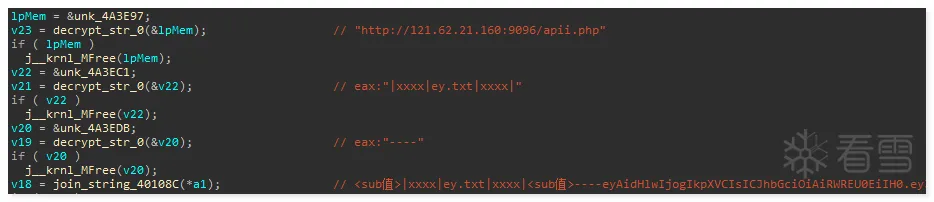 随后样本会解密出要接收数据的网址及一些分隔符,以 "<sub值>|xxxx|ey.txt|xxxx|<sub值>----Token 标识……" 的方式拼接以备上传: