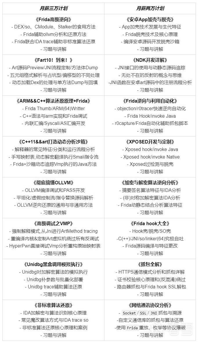 - 在月薪两万计划中,我们更加注重的是实际工作中遇到的各种场景、实际工作能力的提升,及解决实际问题的能力。因此各种逆向环境的搭建、逆向的综合能力和利用代码的编写是最关键的,这里主要涉及的技术栈也是比较杂的:比如网络、Ubuntu/安卓系统知识、应用安全开发、Frida/JS/py等等、Java技巧,比较考验学员的计算机综合技术基础水平。因此我们从工作实践中的需求出发,推荐大家首先强化安卓Java代码的开发、及各种网络和接口的知识,这两大技能被大量应用到应用安全、漏洞检测、渗透测试、黑灰攻防等方向,我们并不推荐具体的书目,只要涉及Java、安卓和网络的图书,都可以。有句话叫做开发的高度,决定了你逆向的高度,希望大家利用好开班前的时间,强化一下Java和网络开发的能力。