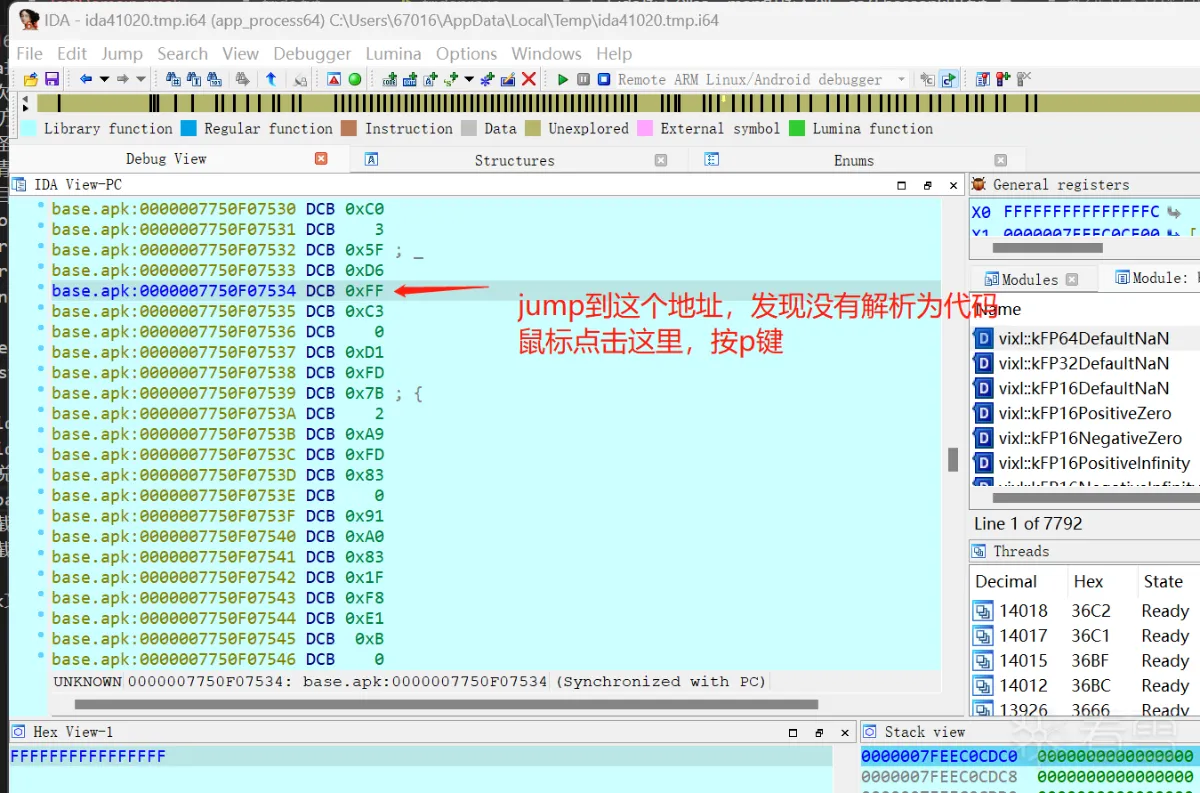 3 双击base.apk,使用frida 打印出的方法地址,在ida中jump到指定的地址,发现是一堆code,没有识别为指令