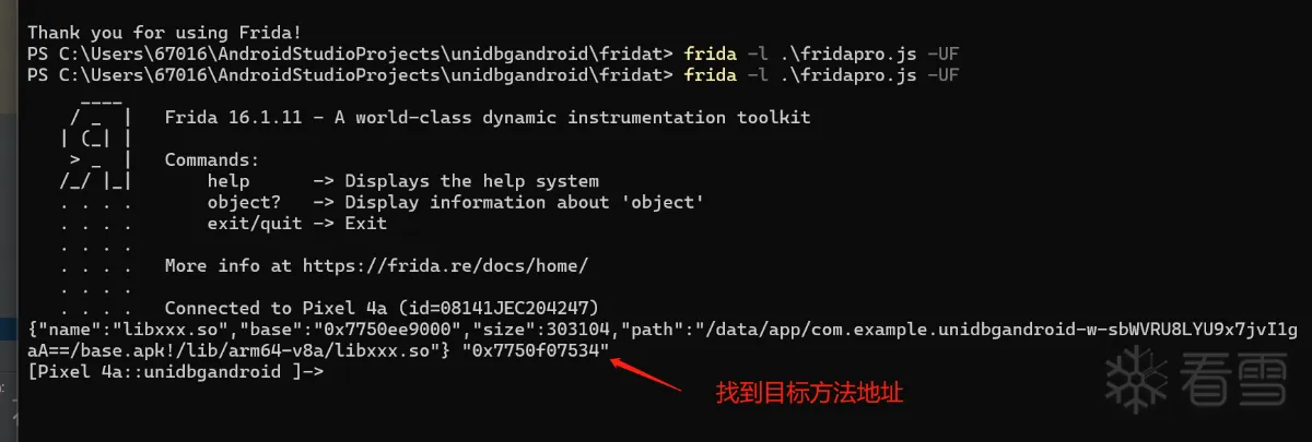 1 启动目标app,用frida attach方式启动frida注入到目标app,将目标方法的内存地址打印出来,这里的目的是为了打印出目标方法的内存地址