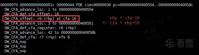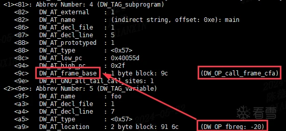 foo地址 = DW_OP_fbreg - 20,并且,DW_OP_fbreg = DW_AT_frame_base = DW_OP_call_frame_cfa。