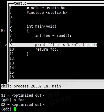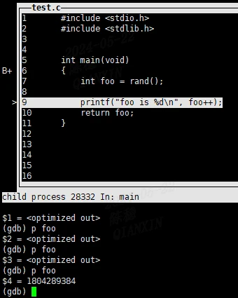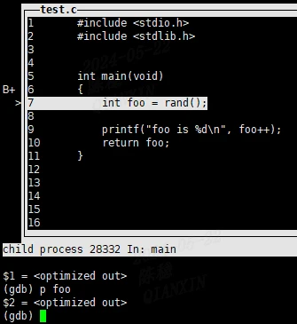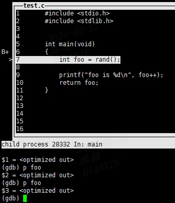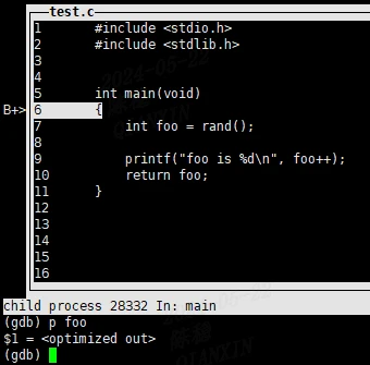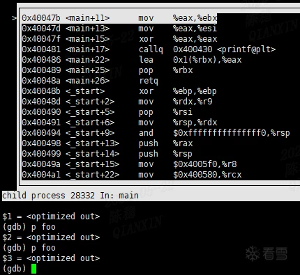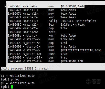 此时RIP指向main()函数的第一条指令,打印foo变量,显示"<optimized out>"