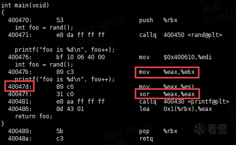 另一方面,[0x400476, 0x40047f)区间的指令,都未修改rax寄存器,但是执行到0x400481处时,eax寄存器就被异或为0了,所以从0x400481开始,需要从rbx寄存器,获取foo的值(0x40047b处的指令,已经将eax备份到ebx了)。