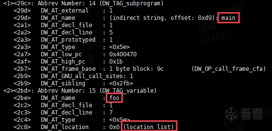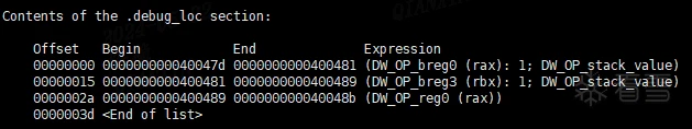 .debug_loc节区内容表示,执行到[0x40047d, 0x400481)指令时,rax寄存器的值,即为foo的值,执行到[0x400481, 0x400489)指令时,rbx寄存器的值,即为foo的值。