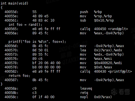 "pc=000000000040055d..000000000040058c",与main()函数指令地址区间对应,最终计算出:foo地址 = rbp-4,这与反汇编代码中,将rand()返回值压入"-0x4(%rbp)"吻合,并且由于gcc的事先准备,gdb可以始终可以从main()函数的栈帧中读到foo的值。