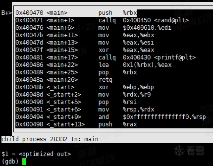 一方面,其实执行到0x400476时,即rand()一执行完,就可以通过"p $rax",知道foo的值了,但是gcc生成的起始地址是0x40047d,那"p foo"就只能晚一点才能显示出来;