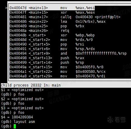 此时RIP指向main()函数的第四条指令,打印foo变量,仍然显示"<optimized out>"。