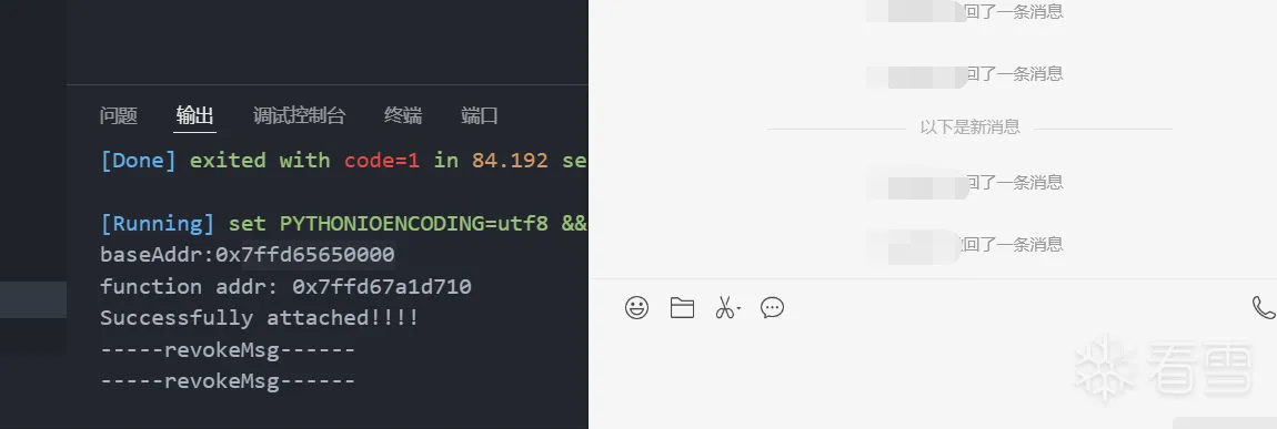 测试脚本如下,首先我们获取了dll的加载地址,然后通过ida查看到函数的偏移地址,将dll地址加上该偏移地址,即可得到内存中该函数的地址,那么如何确定哪一个才是撤回相关函数? 就是靠试,使用到msg相关字符串的函数我们都hook一遍,然后触发撤回功能,如果打印出来revokeMsg就说明hook成功。