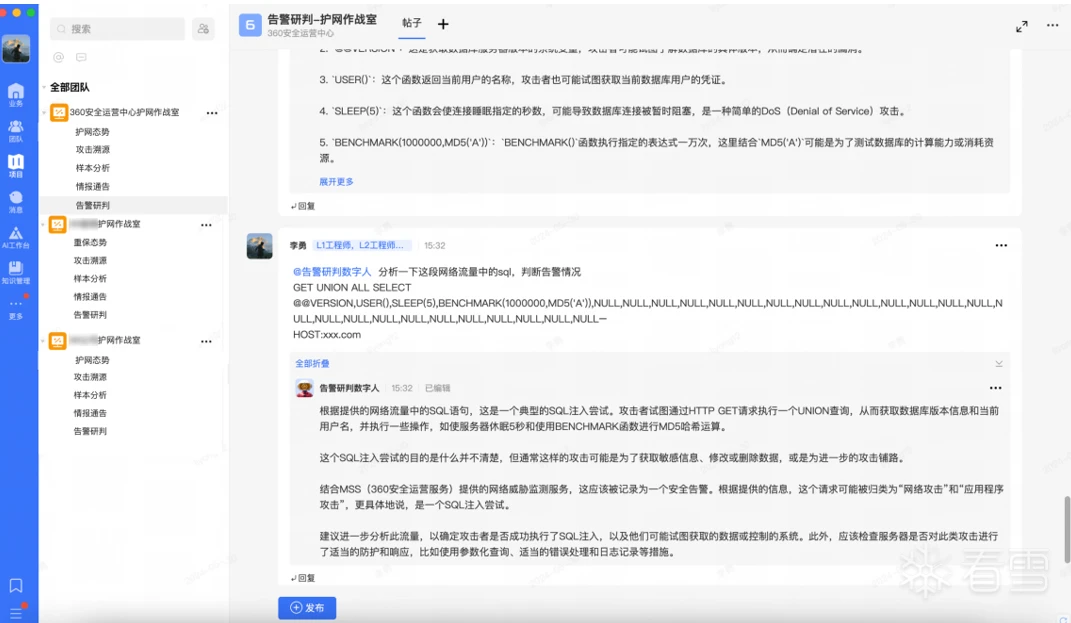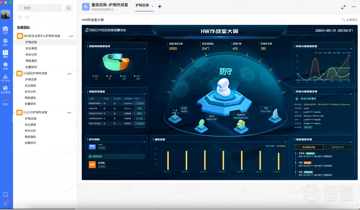 为了给安全团队提供独立安全工作入口,以便其聚焦精力,快速投入到部署、备战、迎战、实战、总结等阶段相关工作,360上线重保专属作战室,360 AI军团在作战室以SaaS形态为防守各方角色提供服务,与安全运营工程师协同作战,高效应对网络攻击,持续保障用户安全与稳定。