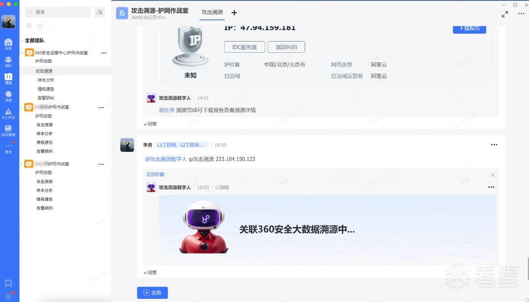 战场上,将军指挥作战,离不开分析敌情、出谋划策的军师智囊。在攻防演练中,360 AI军团的告警研判、样本分析、攻击溯源等岗位的数字人齐心协力,帮助运营人员在在智能化运营中实现自动溯源和结果定性。