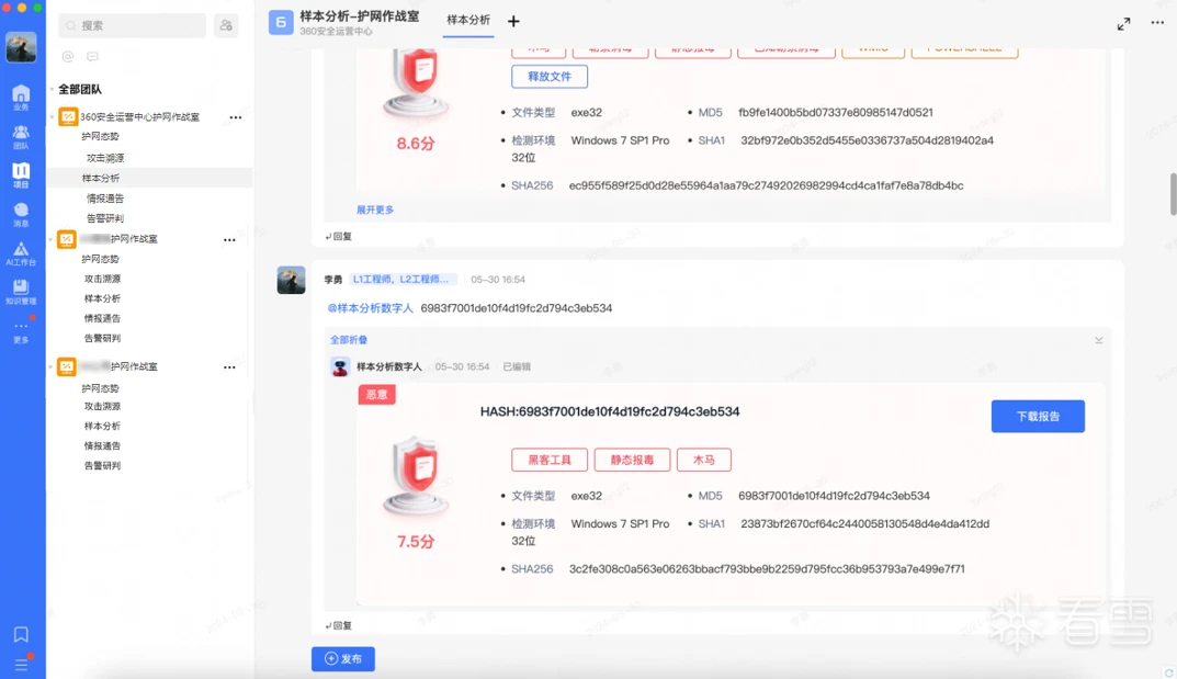 样本分析数字人可以支持日常所有类型的文件检测,在收到样本信息后,依托360全球规模最大的安全大数据平台和攻防对抗威胁图谱,对检测样本进行恶意定性,迅速输出分析报告,帮助安全运营人员聚焦需关注的安全告警并采取相应的防护措施,形成威胁管理闭环。