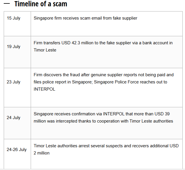 随后,在未进一步核实的情况下,该公司于7月19日将4230万美元转账至该虚假账户。四天后,真实的供应商联系该公司,表示尚未收到付款,此时该公司才意识到可能遭遇了欺诈,遂立即报案。在此之后,新加坡警方利用INTERPOL的全球快速支付干预机制(I-GRIP),请求东帝汶当局的协助。通过这一机制,警方成功冻结了3900万美元的资金,并逮捕了七名嫌疑人,最终追回了总计4100万美元的资金。