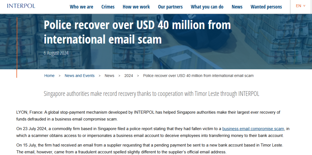 根据国际刑警组织(INTERPOL)最近的报告,警方成功从一起国际电子邮件诈骗案中追回了超过4000万美元资金,这也是有史以来最大规模的追回记录。