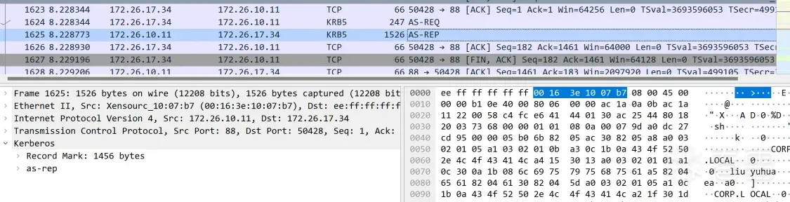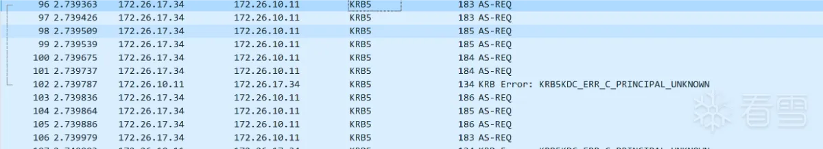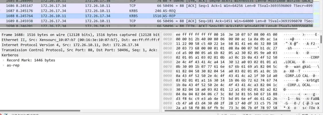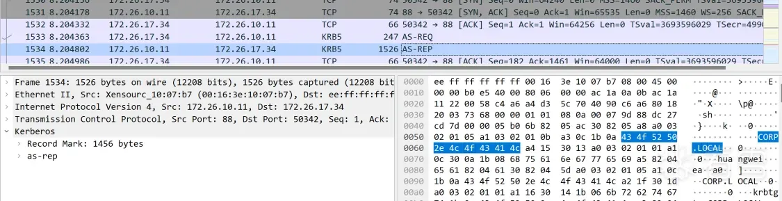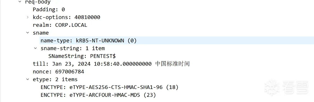 这个就是Kerberos认证第一阶段,当客户端用户需要访问域内服务时,客户端的Kerberos服务会向域控制器(DC)的认证服务(AS)发送一个认证请求(AS_REQ)。这个请求包含了使用用户NTLM哈希值加密的时间戳,以及客户端和服务端的信息。