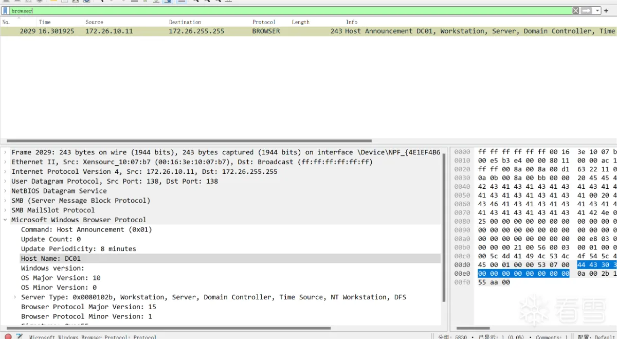 那就找域控制器的用户名称,这时候去审一下browser协议(浏览器协议),因为要是域所以完整就是dc01.corp.local