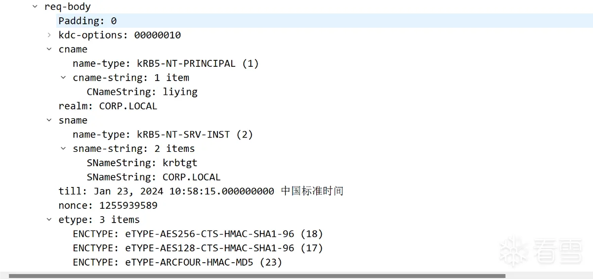 然后我们继续去分析请求包体,在这里面cname就是客户端,下面的CNameString为用户名,realm为域控制器的名称,sname就是服务器,下面的kerberos.SNameString为域名。
