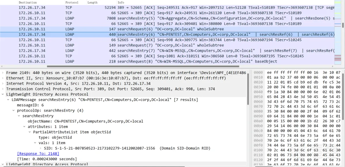 添加值一般出现在searchResEntry(LDAP(轻量目录访问协议))里面,在上面去寻找变化,前五个没什么变化到第六个的时候发现添加了SID(标识用户、组和计算机帐户的唯一的号码),所以添加的就是S-1-5-21-807850523-2173102279-1412002087-1556
