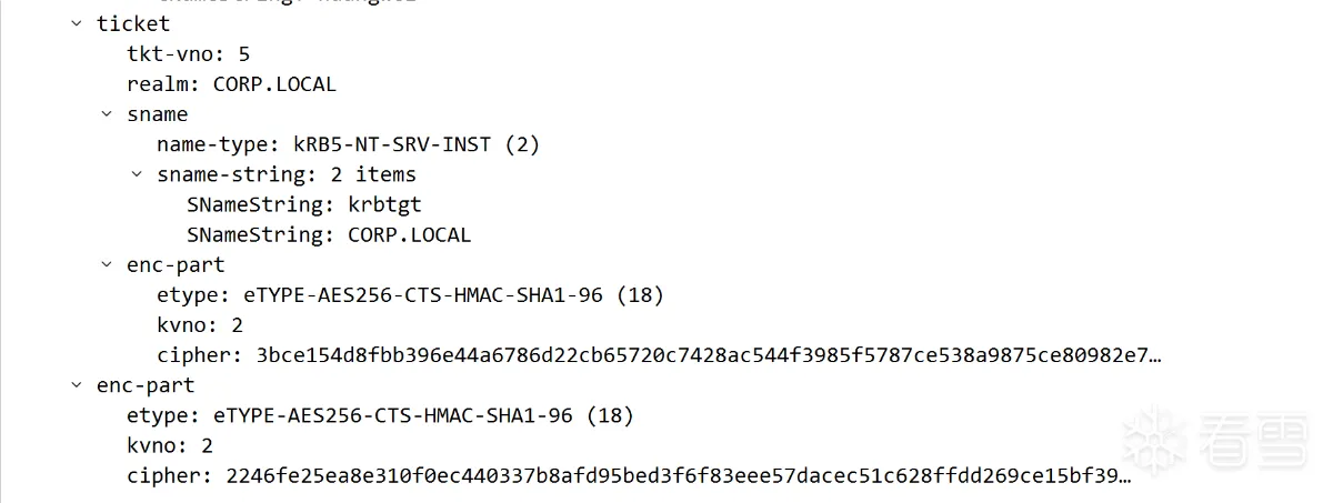 返回的数据除了一些客户端信息、和服务端信息外,还ticket和enc-part。