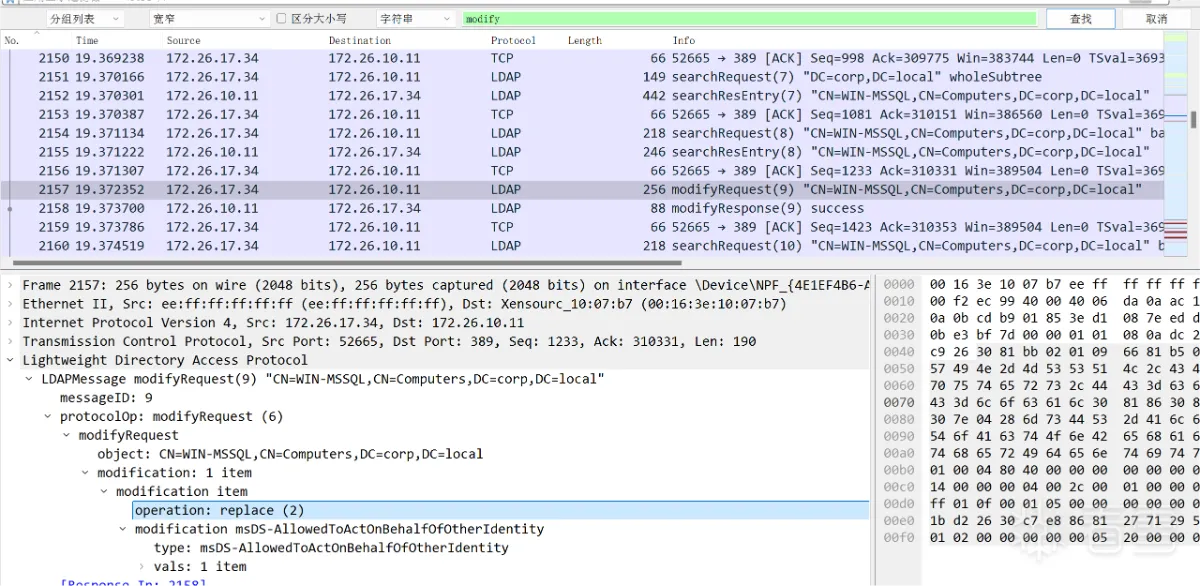 因为是修改,搜索以下modify,发现在LDAP(轻量级目录访问协议)找到了ModifyRequest,这时候去找回显为success的就可以了,msDS-AllowedToActOnBehalfOfOtherIdentity
