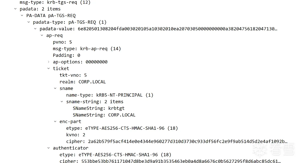 在下面的enc_part部分可以看到首先根据TGT生成临时票据,这个TGT(票据授权票据)能看出来就是前面AS_REQ生成的TGT,然后在Authenticator里面是使用Session key加密的客户端信息、服务端信息和时间戳。
