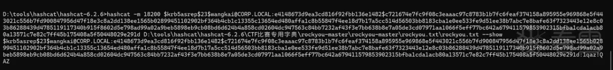 1 | hashcat -m 18200 $krb5asrep$23$wangkai@CORP.LOCAL:e4148673d9ea3cd816f92fbb136e1482$c721674e7fc9f08c3eaaac97c8783b1b7fc6feaf374158a895955e969868e5f443021c556b7fd900847956d47f18e3c8a2dd138ee1565b02899451102902bf364b4cb1c13355c13654ed480affa1c8b55847f4ee18d7b17a5cc514d56503bb8183cba1e0ee533fe9d51ee38b7abc7e8bafe63f7323443e12e8c03b86288439d4785119117340b915f8602d5e798ad99a02a9beb5898eb9cb08bd6d624b4a858cd02604dc947563c84bb7232af43f3e7bb638b8e7a05de3cd07971aa1066f5eff77bc642a679411579853902315bfba1cda1acb80a13571c7e82c7ff45b175408a5f50448029e291d D:\tools\hashcat\hashcat-6.2.6\CTF比赛专用字典\rockyou-master\rockyou-master\rockyou.txt\rockyou.txt --show