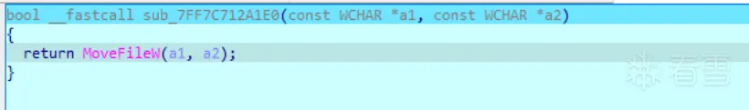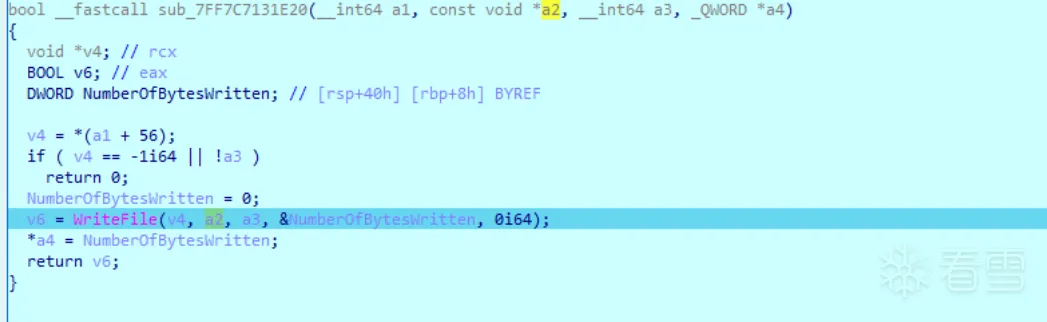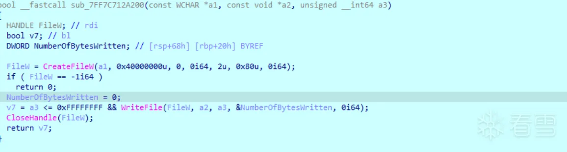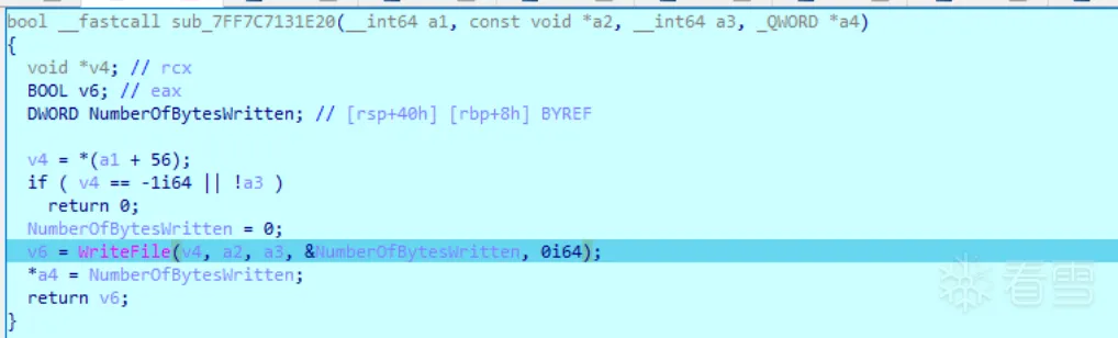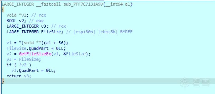 1 2 3 4 5 6 7 8 9 10 11 12 13 14 15 16 17 18 19 | bool __fastcall sub_7FF7C7131D50(__int64 a1, LARGE_INTEGER a2, DWORD a3){ void *v3; // rcx BOOL v5; // eax bool v6; // bl DWORD LastError; // eax v3 = *(a1 + 56); if ( v3 == -1i64 ) return 0; v5 = SetFilePointerEx(v3, a2, 0i64, a3); v6 = v5; if ( !v5 ) { LastError = GetLastError(); sub_7FF7C712CDD0(1, L"Cant set file position... %d\n", LastError); } return v6;} |