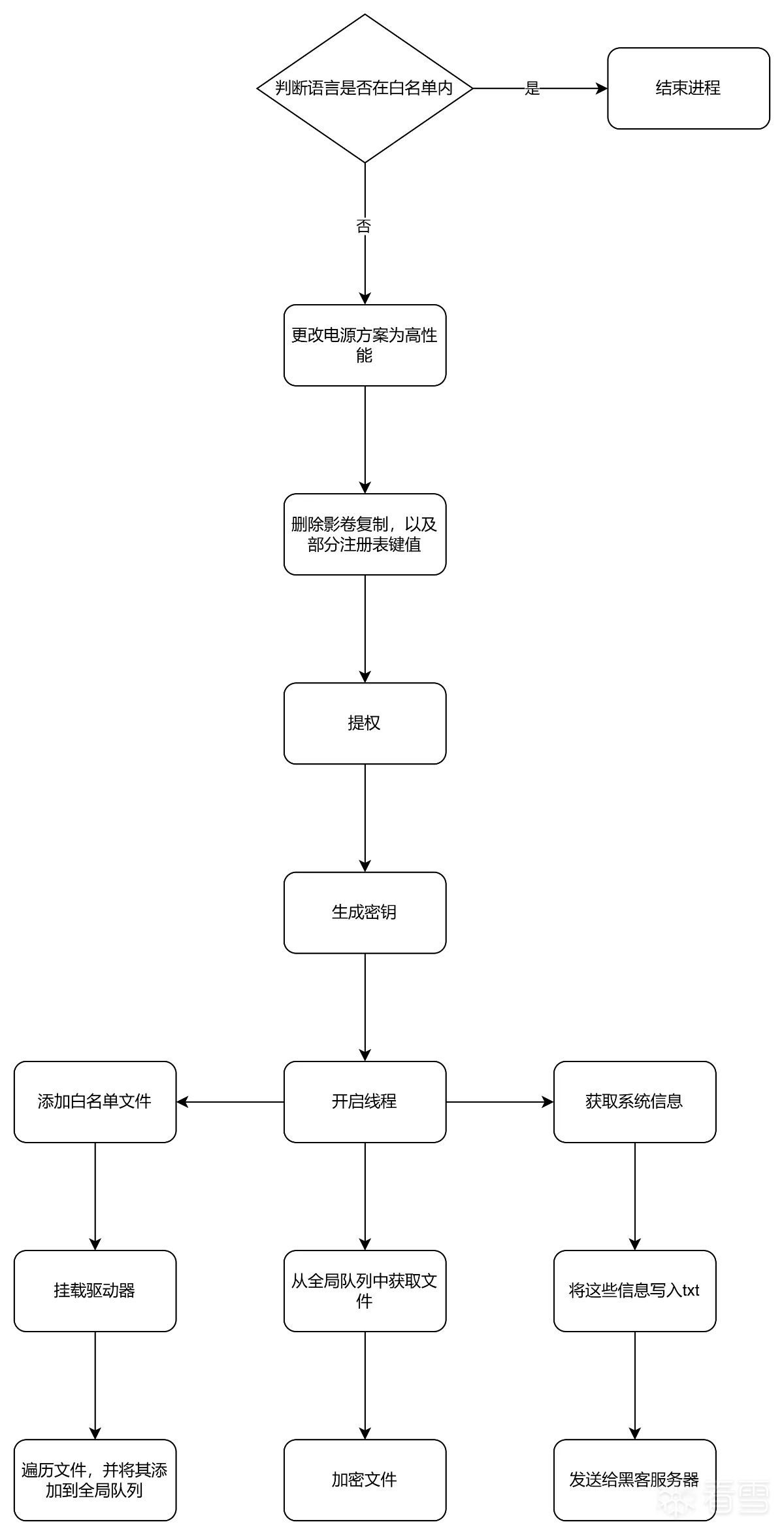 它通过判断系统语言来决定是否加密,并在语言符合条件时执行加密。病毒更改电源方案为高性能,删除关键注册表项,禁用备份服务,防止数据恢复。同时,通过提权操作提升系统权限,确保病毒执行成功。密钥生成结合了随机数、梅森旋转算法和SHA256哈希,使用Curve25519生成共享密钥。最后,病毒收集系统信息,包括计算机名称、用户名、操作系统版本、网卡和磁盘空间,用于后续攻击或监控。