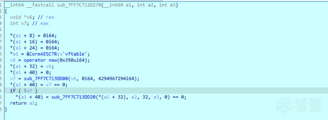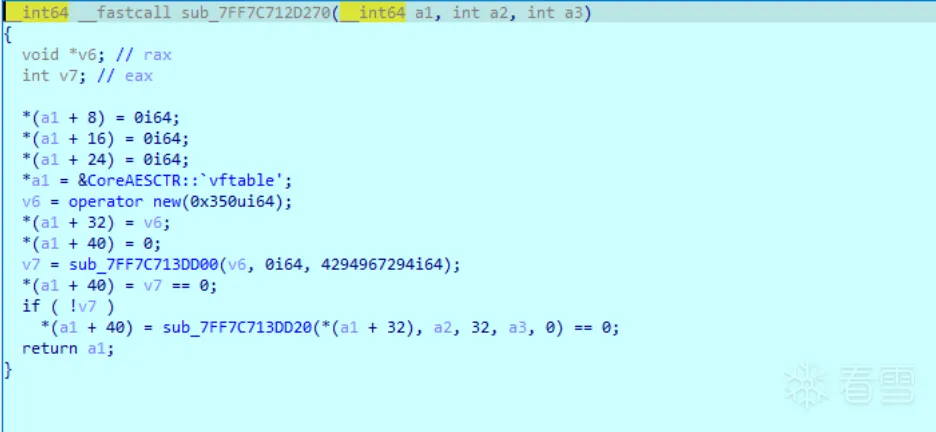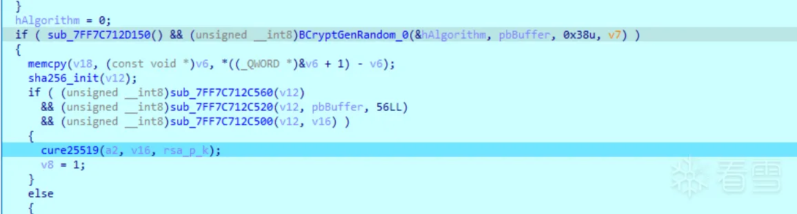 文件加密使用了chacha20加密算法和aes-ctr算法(用于加密密钥),其中chacha20的密钥为CryptGenRandom函数生成。aes的key则为cure25519算法生成的共享密钥的sha256生成的,iv则为CryptGenRandom函数生成
