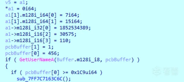 1 2 3 4 5 6 7 8 9 10 11 12 13 14 15 16 17 18 19 20 21 22 23 24 25 26 27 28 29 30 31 32 33 34 35 36 37 38 39 40 41 42 43 44 45 46 47 48 49 50 51 52 53 54 55 56 57 58 59 60 | int sub_7FF7C7131220(){ HANDLE FirstVolumeW; // rax void *v1; // rsi WCHAR i; // bx BOOL NextVolumeW; // edi WCHAR j; // bx DWORD cchReturnLength; // [rsp+20h] [rbp-E0h] BYREF WCHAR szVolumeMountPoint; // [rsp+28h] [rbp-D8h] BYREF int v8; // [rsp+2Ah] [rbp-D6h] __int16 v9; // [rsp+2Eh] [rbp-D2h] WCHAR szVolumeName; // [rsp+30h] [rbp-D0h] BYREF __m128i v11[32]; // [rsp+32h] [rbp-CEh] BYREF __m128i szVolumePathNames[33]; // [rsp+240h] [rbp+140h] BYREF szVolumeName = 0; sub_7FF7C718EC80(v11, 0, 0x206ui64); FirstVolumeW = FindFirstVolumeW(&szVolumeName, 0x104u); v1 = FirstVolumeW; if ( FirstVolumeW != -1i64 ) { sub_7FF7C718EC80(szVolumePathNames, 0, 0x208ui64); cchReturnLength = 0; GetVolumePathNamesForVolumeNameW(&szVolumeName, szVolumePathNames, 0x104u, &cchReturnLength); if ( cchReturnLength == 1 ) { for ( i = 67; i <= 0x5Au; ++i ) { szVolumeMountPoint = i; v8 = 6029370; v9 = 0; if ( SetVolumeMountPointW(&szVolumeMountPoint, &szVolumeName) ) break; } } do { NextVolumeW = FindNextVolumeW(v1, &szVolumeName, 0x104u); LODWORD(FirstVolumeW) = GetVolumePathNamesForVolumeNameW( &szVolumeName, szVolumePathNames, 0x104u, &cchReturnLength); if ( FirstVolumeW && cchReturnLength == 1 ) { for ( j = 67; j <= 0x5Au; ++j ) { szVolumeMountPoint = j; v8 = 6029370; v9 = 0; LODWORD(FirstVolumeW) = SetVolumeMountPointW(&szVolumeMountPoint, &szVolumeName); if ( FirstVolumeW ) break; } } } while ( NextVolumeW ); } return FirstVolumeW;} |