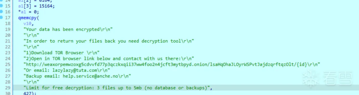 1 2 3 4 5 6 7 8 9 10 11 | Your data has been encryptedIn order to return your files back you need decryption tool1)Download TOR Browser 2)Open in TOR browser link below and contact with us there:http://weaxorpemwzoxg5cdvvfd77p3qczkxqii37ww4foo2n4jcft3mxxxxxx.onion/lsaHqOhaJLOyrWSPvtJajdzqrftqzOlt/B8953D4C242BDFA012F88510DF9ABC5B5A606C6E31703F4D670603FF8D971E4COr email: lazylazy@tuta.comBackup email: help.service@anche.noLimit for free decryption: 3 files up to 5mb (no database or backups) |
