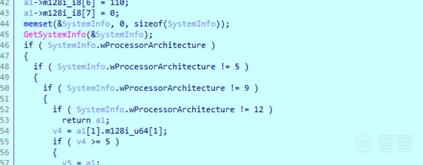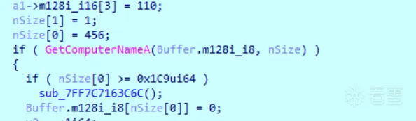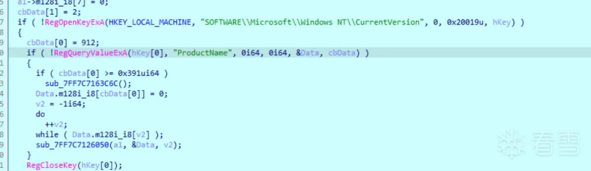 1 2 3 4 5 6 7 8 9 10 11 12 13 14 15 16 17 18 19 20 21 22 23 24 25 26 27 28 29 30 31 32 33 34 | __m128i *__fastcall sub_7FF7C712ACB0(__m128i *a1){ unsigned __int64 v2; // r8 DWORD cbData[2]; // [rsp+30h] [rbp-208h] BYREF HKEY hKey[3]; // [rsp+38h] [rbp-200h] BYREF __m128i Data; // [rsp+50h] [rbp-1E8h] BYREF hKey[1] = a1; *a1 = 0i64; a1[1].m128i_i64[0] = 7i64; a1[1].m128i_i64[1] = 15i64; a1->m128i_i32[0] = 1852534389; a1->m128i_i16[2] = 30575; a1->m128i_i8[6] = 110; a1->m128i_i8[7] = 0; cbData[1] = 1; if ( !RegOpenKeyExA(HKEY_LOCAL_MACHINE, "HARDWARE\\DESCRIPTION\\System\\CentralProcessor\\0", 0, 0x20019u, hKey) ) { cbData[0] = 456; if ( !RegQueryValueExA(hKey[0], "ProcessorNameString", 0i64, 0i64, &Data, cbData) && cbData[0] ) { if ( cbData[0] >= 0x1C9ui64 ) sub_7FF7C7163C6C(); Data.m128i_i8[cbData[0]] = 0; v2 = -1i64; do ++v2; while ( Data.m128i_i8[v2] ); sub_7FF7C7126050(a1, &Data, v2); } RegCloseKey(hKey[0]); } return a1;} |