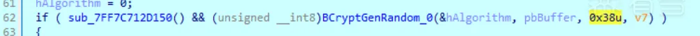 1 2 3 4 5 6 7 8 9 10 | bool __fastcall sub_7FF7C712D5C0(NTSTATUS *a1, UCHAR *a2, signed int a3){ NTSTATUS v4; // eax if ( a3 < 1 ) return 0; v4 = BCryptGenRandom(0i64, a2, a3, 2u); *a1 = v4; return v4 >= 0;} |
