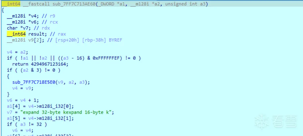 1 2 3 4 5 6 7 8 9 10 11 12 13 14 15 16 17 18 19 20 21 22 23 24 25 26 27 28 29 30 31 32 33 34 35 36 37 38 | __int64 __fastcall sub_7FF7C713AE60(_DWORD *a1, __m128i *a2, unsigned int a3){ __m128i *v4; // r9 __m128i *v6; // rcx char *v7; // rdx __int64 result; // rax __m128i v9[2]; // [rsp+20h] [rbp-38h] BYREF v4 = a2; if ( !a1 || !a2 || ((a3 - 16) & 0xFFFFFFEF) != 0 ) return 4294967123i64; if ( (a2 & 3) != 0 ) { sub_7FF7C718E5E0(v9, a2, a3); v4 = v9; } v6 = v4 + 1; a1[4] = v4->m128i_i32[0]; v7 = "expand 32-byte kexpand 16-byte k"; a1[5] = v4->m128i_i32[1]; if ( a3 != 32 ) v6 = v4; a1[6] = v4->m128i_i32[2]; a1[7] = v4->m128i_i32[3]; if ( a3 != 32 ) v7 = "expand 16-byte k"; a1[8] = v6->m128i_i32[0]; a1[9] = v6->m128i_i32[1]; a1[10] = v6->m128i_i32[2]; a1[11] = v6->m128i_i32[3]; *a1 = *v7; a1[1] = *(v7 + 1); a1[2] = *(v7 + 2); a1[3] = *(v7 + 3); result = 0i64; a1[16] = 0; return result;} |
