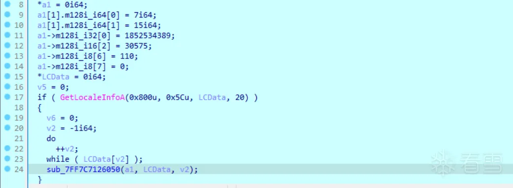 1 2 3 4 5 6 7 8 9 10 11 12 13 | bool sub_7FF7C71326D0(){ LANGID UserDefaultLangID; // ax int v2[2]; // [rsp+20h] [rbp-28h] BYREF __int16 v3; // [rsp+28h] [rbp-20h] char v4[6]; // [rsp+2Ah] [rbp-1Eh] BYREF v2[0] = 0x43F0419; v3 = 0x444; v2[1] = 0x4220423; UserDefaultLangID = GetUserDefaultLangID(); return sub_7FF7C7140300(v2, v4, UserDefaultLangID) != v4;} |