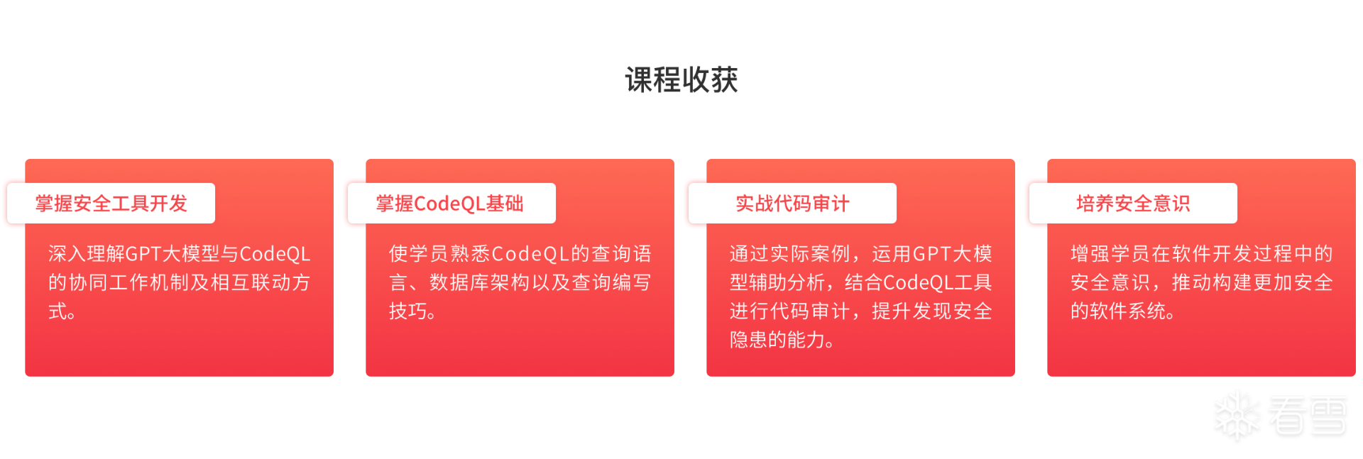 为了提升开发者在代码审计方面的能力,设计了“GPT大模型结合CodeQL开发代码审计课程”,旨在通过前沿技术的融合应用,为学员提供一套全面而高效的代码审计解决方案。
