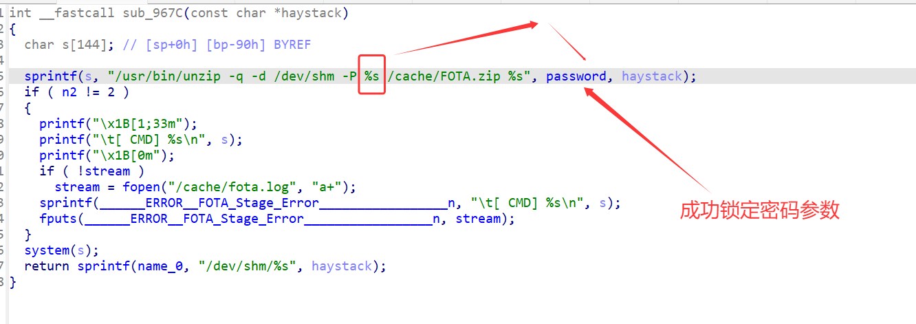 由于下载的固件是可以被路由器下载并且解压更新的所以程序中一定会将压缩包的压缩密码进行硬编码,所以直接搜索程序中那个地方使用unzip进行解压的时候使用了密码参数就可以锁定了:
