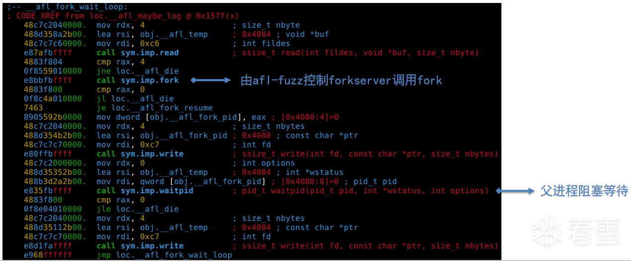 afl将一个循环__afl_fork_wait_loop插桩到目标中,每当AFL需要执行一个测试用例时,由afl-fuzz控制forkserver调用fork,子进程进行模糊测试的覆盖率统计,父进程阻塞等待。